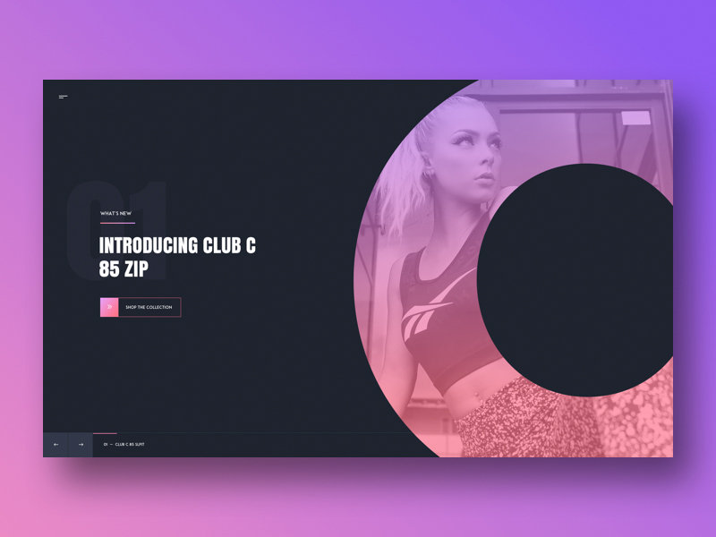 剪貼蒙版效果,可以通過底層的元素來約束上層的元素形狀。近年來流行在底層使用加速的字母或者文字營造形式感十足的視覺效果。這個網(wǎng)頁中,圖片素材還疊加上了一層漸變色,加上黑色和文本,整個頁面簡單,但是層次并不少,比較高級。