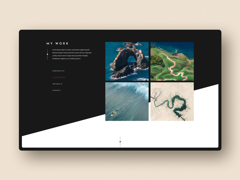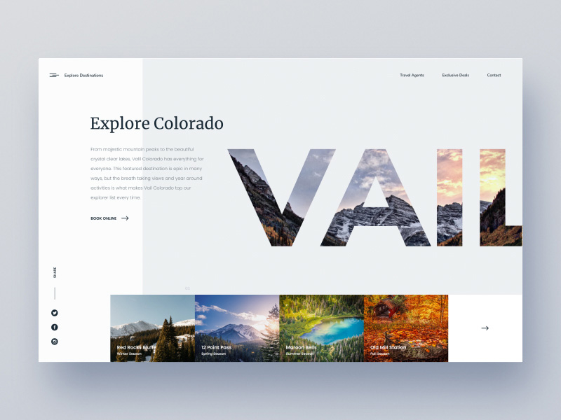 同樣是使用了文字剪貼蒙版的效果,但是這個頁面讓被剪切圖片和文本所傳達(dá)的信息,保持了一致,圖片中風(fēng)景所在地的名字和文本相互呼應(yīng)。切換底部圖片的時候,右上角的內(nèi)容也相應(yīng)的改變。這種設(shè)計讓布局得到簡化,但是信息量確倍增,相當(dāng)值得學(xué)習(xí)。