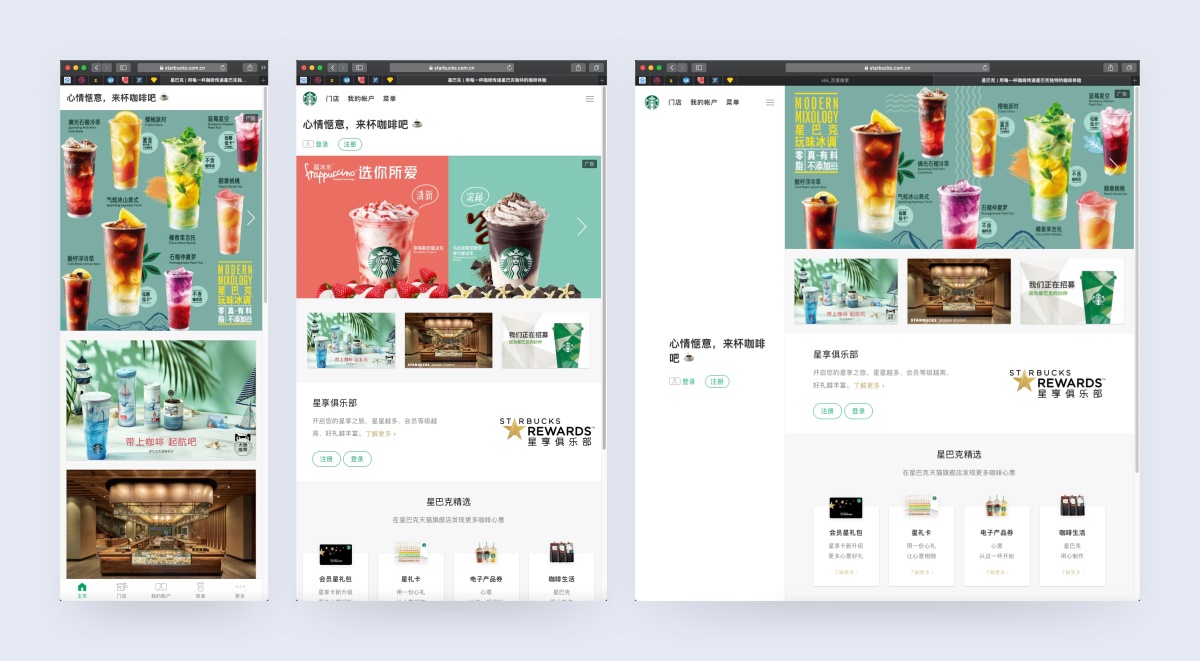 先說說第一種,可能有不少人已經(jīng)聽過響應式布局和自適應設計的大名,先不論它們有什么區(qū)別,它們代表了網(wǎng)頁顯示內(nèi)容隨瀏覽器窗口尺寸變化而變化的技術,比如使用 Bootstrap 架構的星巴克官網(wǎng),更改瀏覽器窗口寬度后,可以得到以下不同的結果。