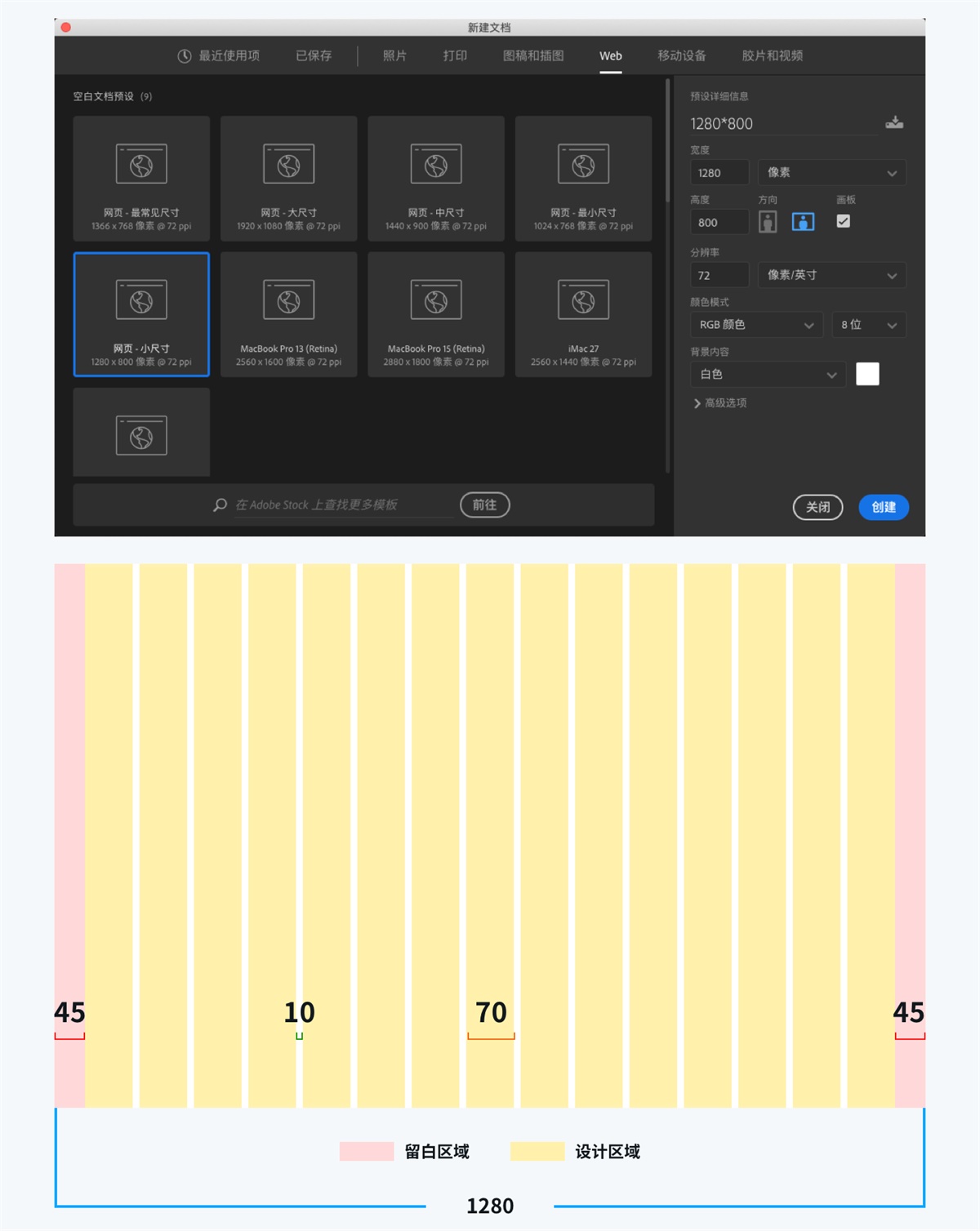 如果選擇適配 1280,那么設計內(nèi)容的區(qū)域?qū)捦ǔ?1180、1190。而在適配 1024 下,那么內(nèi)容區(qū)域?qū)挸R姷木陀?950、970、990 等。當我們創(chuàng)建完完整分辨率的畫布,再通過參考線的方式將內(nèi)容區(qū)域規(guī)劃出來即可。
