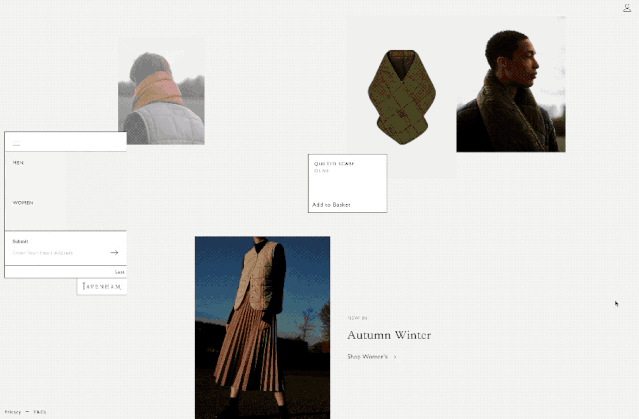 這樣類(lèi)型的網(wǎng)頁(yè),可以更好地利用圖像去做一些簡(jiǎn)約的設(shè)計(jì)。這個(gè)服裝的網(wǎng)站,就是利用了疊加和大留白的方式,傳遞出了一種簡(jiǎn)約時(shí)尚的感覺(jué)。