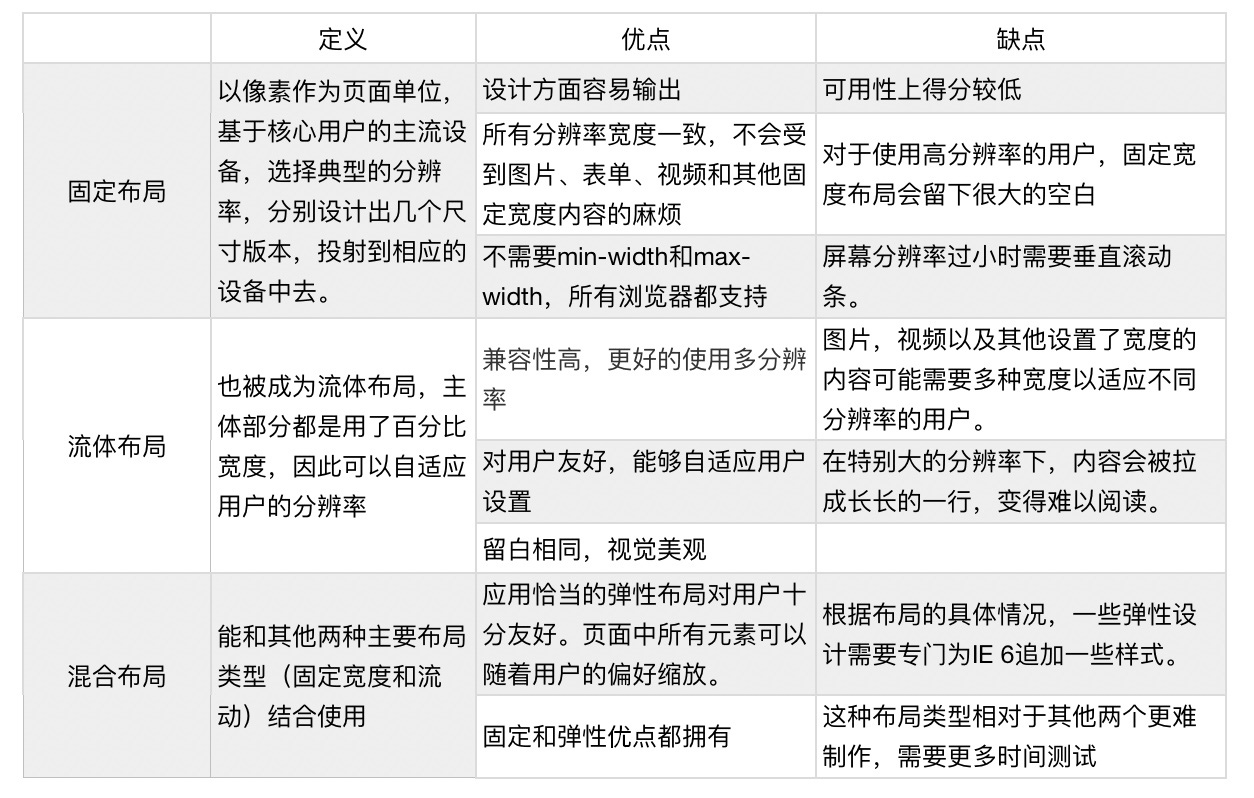 A:包括固定布局、流體布局、混合布局、響應(yīng)式布局。
