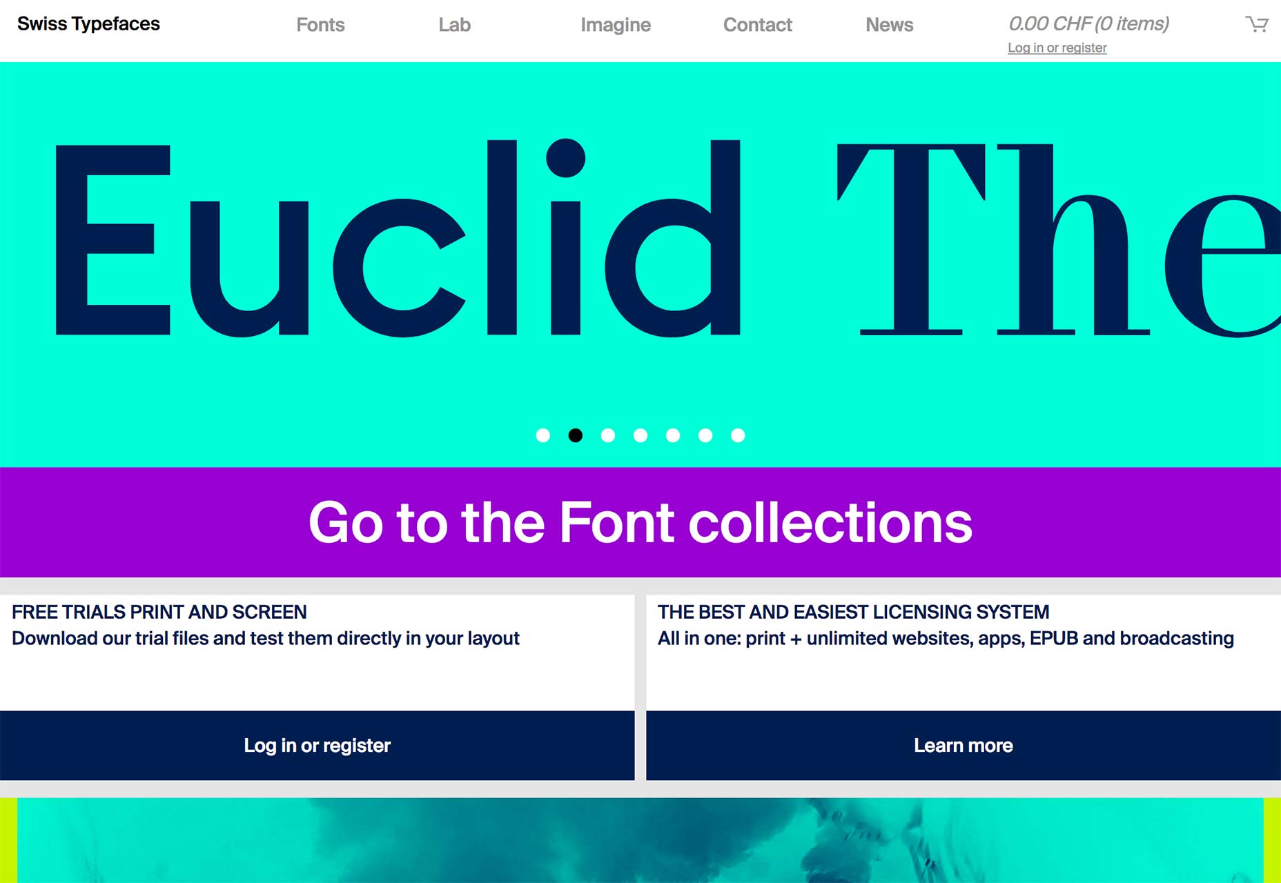 Swiss Typefaces 是一個風格大膽視覺突出的字體供應商,他們并沒有使用傳統(tǒng)的白底黑字來呈現(xiàn),而是使用對比強烈的紫色和綠色來搭配黑白兩色來凸顯字體的輪廓和細節(jié)。