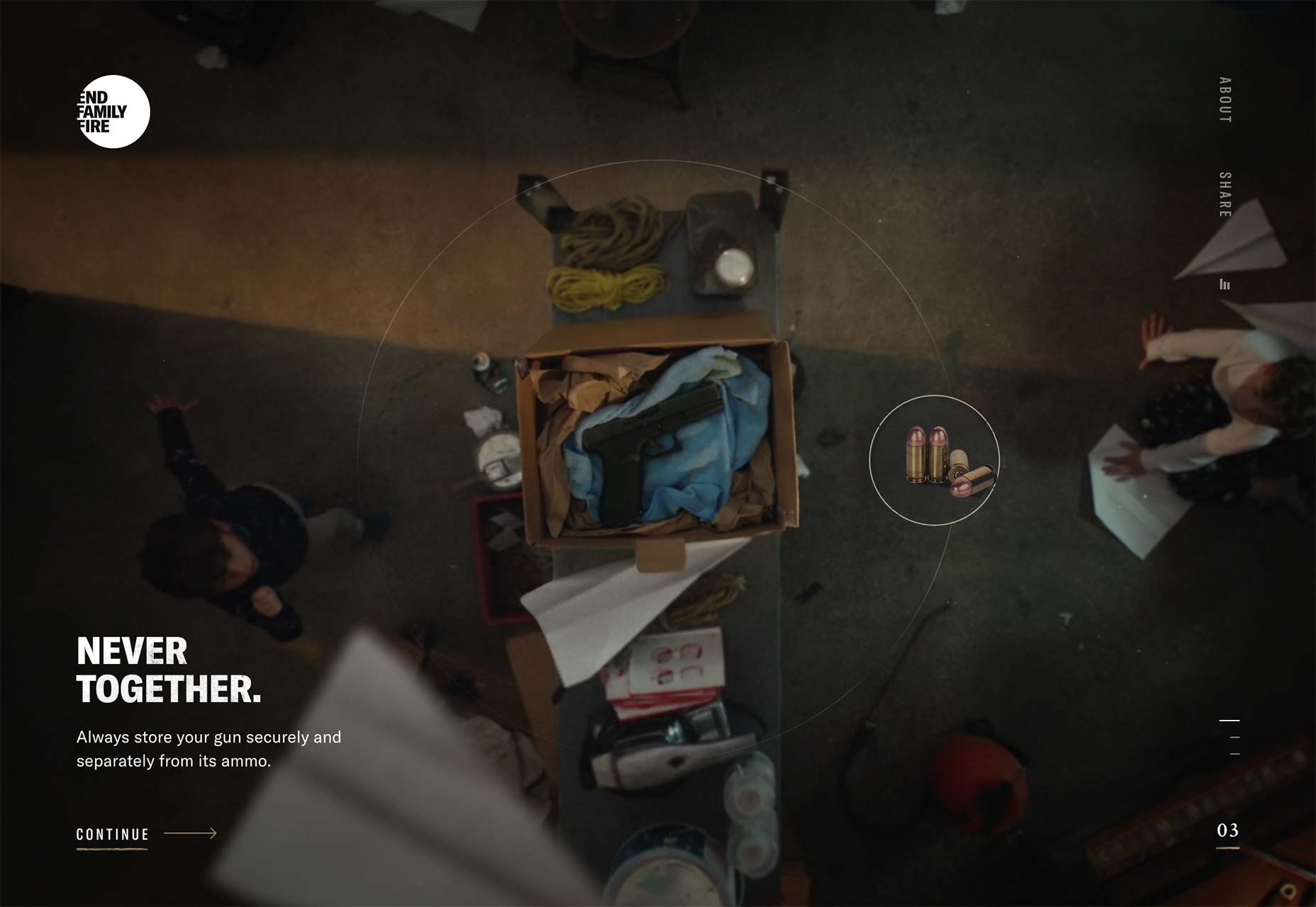 Family Fire 指的是因為槍械保存不當而造成的家庭槍擊事故。這個網(wǎng)站是旨在使用藝術而具有互動性的設計來教育用戶,降低相關事故發(fā)生的機率,讓大家家庭更加安全。