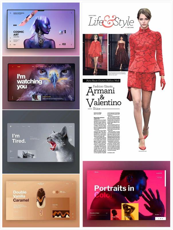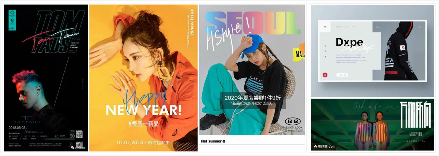 在此基礎(chǔ)上還可以進(jìn)行色彩搭配,而且顏色對比最好要鮮明一點(diǎn),這樣就建立起了強(qiáng)烈的粗細(xì)對比、大小對比、剛?cè)釋Ρ?、色彩對比等。適合在海報(bào)設(shè)計(jì)、畫冊設(shè)計(jì)、網(wǎng)頁設(shè)計(jì)中使用。