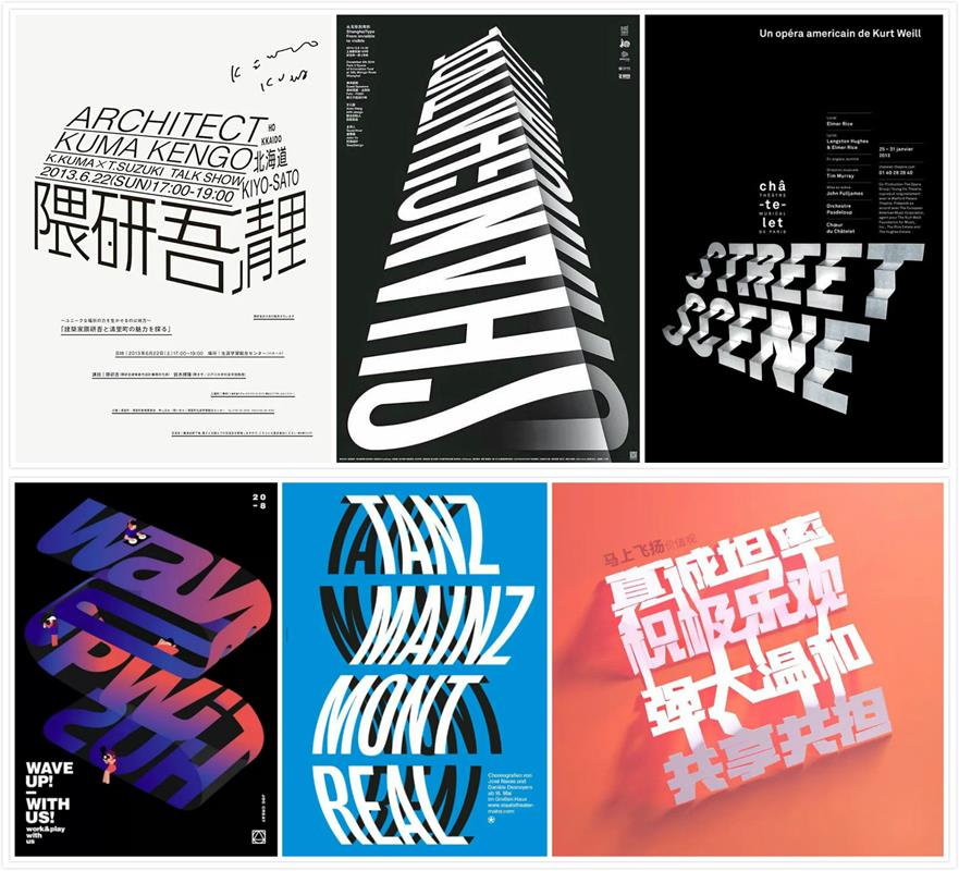 由于文字常見的狀態(tài)是扁平的,所以當(dāng)打破文字這種常規(guī)的狀態(tài),將其圖形化、賦予三維效果時(shí),就會具有很強(qiáng)烈的視覺沖擊。在使用這一技巧時(shí)要注意文字的識別性。