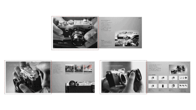 這是一個(gè)關(guān)于相機(jī)的畫冊,一共是 3 組。消除掉這個(gè)畫冊的中線,讓他們變成一張平滑的圖片。